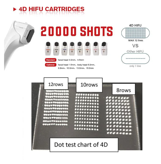 • 3D and 4D HIFU: Cartridges is 1.5/3.0/4.5/6.0/8.0/10/13/16mm. These systems introduced multi-line, customizable grids. You can map out a specific treatment area and fire up to 11 or 12 lines in one pass. It speeds up treatment times and ensures highly uniform energy distribution.