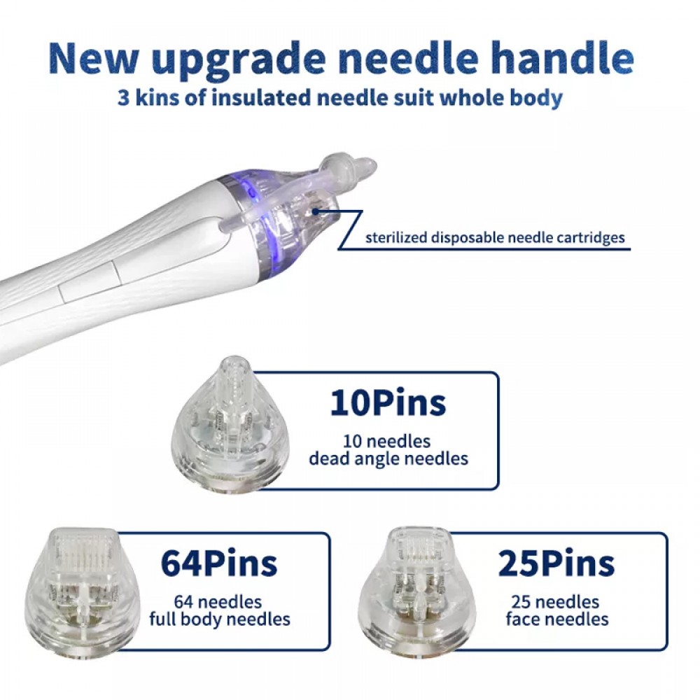 Equipped with 10PIN, 25PIN, and 64PIN needle cartridges, it allows for tailored treatments, targeting fine lines, wrinkles, acne scars, and skin texture issues with exceptional precision. For facial treatments, the maximum needle depth is 2mm, while for body areas, it reaches up to 3.5mm, ensuring optimal results.