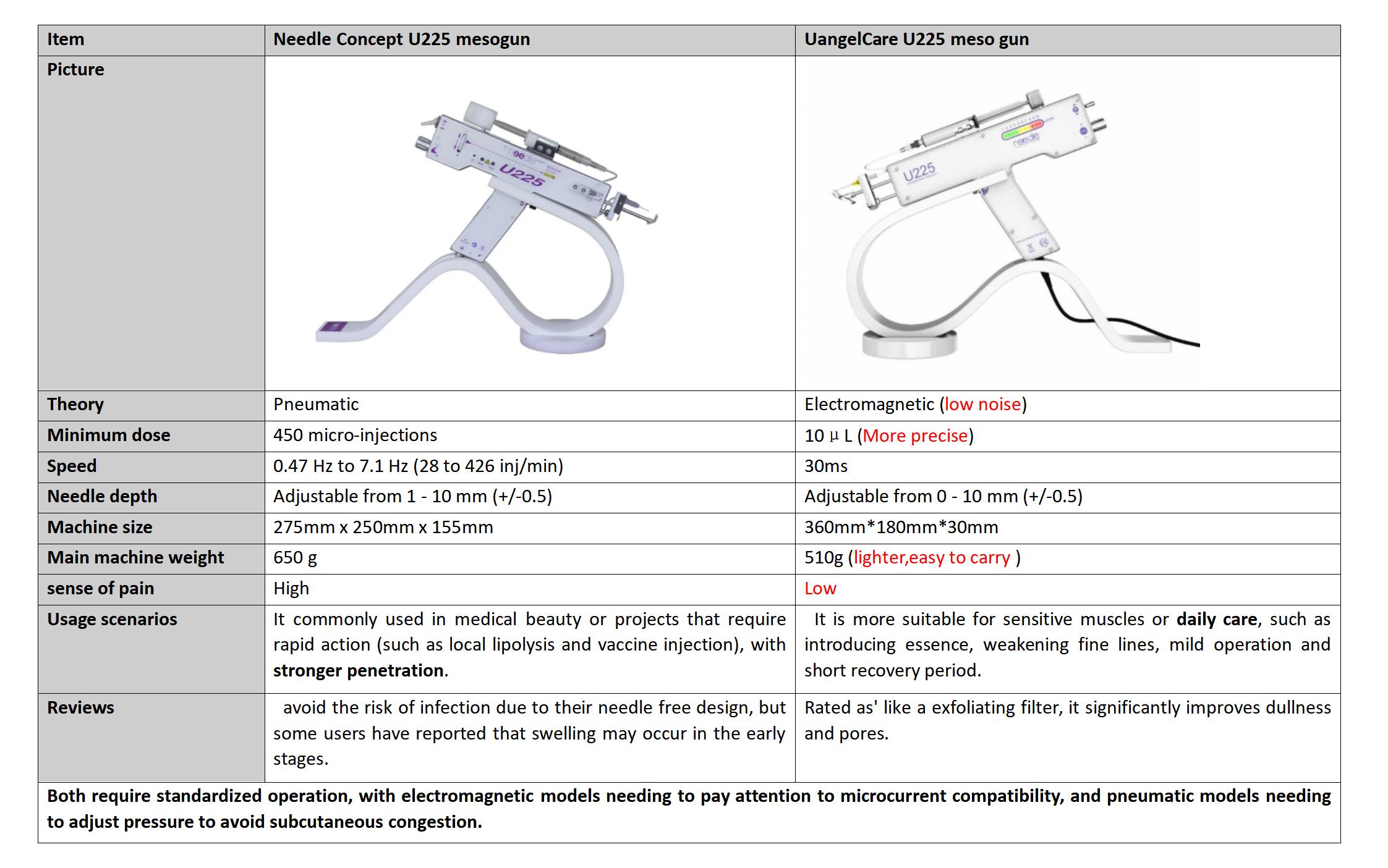 Overview: This paper compares the technical parameters, usage scenarios and user evaluation of Needle Concept U225 Mesogun and UangelCare U225 Meso Gun devices in detail, and emphasizes the differences between the two in theoretical basis, dose accuracy, speed and other aspects.
