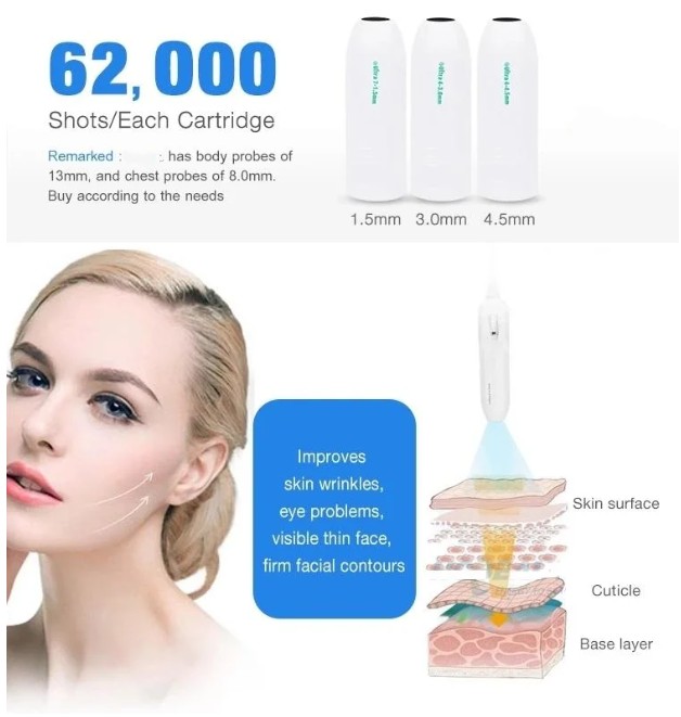 The number of rows is multi-dimensional, the traditional HIFU shot once only can get 1 line, so it will be a little toublesome to do body weight loss. But 4D HIFU can be freely adjusted from 1-12 lines.Treatment of parts and regions are multi-dimensional:facial wrinkles, chest pulling,body weight loss.